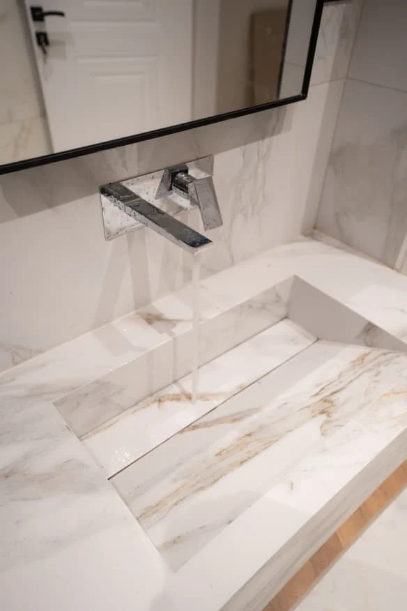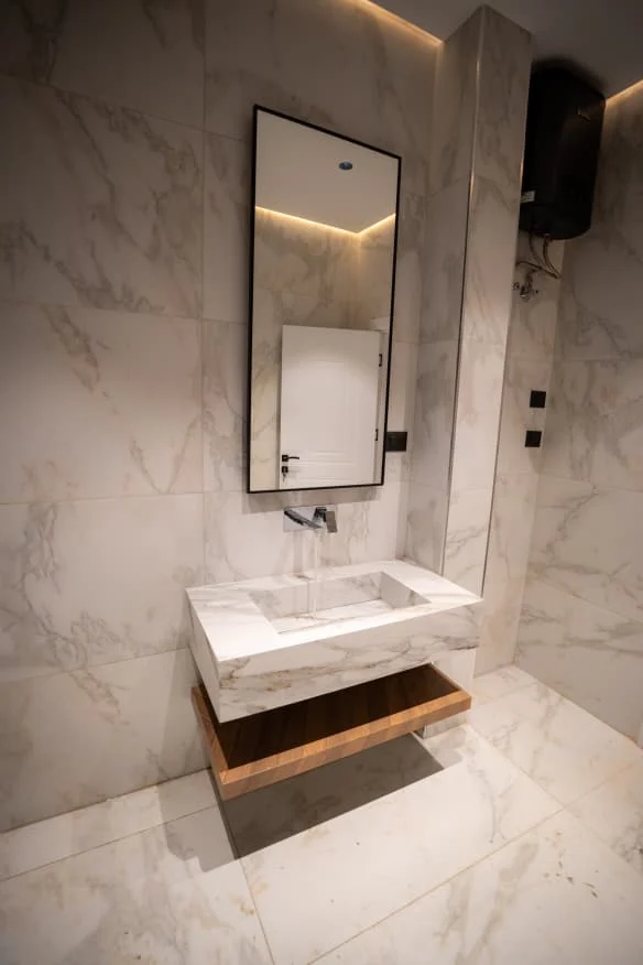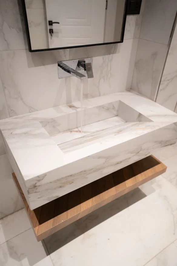 يجسد فخامة تصميم الرخام الطبيعي بلمسة عصرية. بتصميمه المستطيل الانسيابي ولونه الأبيض المتشابك مع عروق ذهبية دقيقة، يمنح حمامك إحساسًا بالاتساع والهدوء. يتميز بجمال الخامة التي تجمع بين صلابة البورسلين ودفء العروق، مما يجعله نقطة محورية في أي ديكور. يُثبت هذا الحوض على حامل خشبي، مما يضيف تباينًا جميلًا بين الملمس الناعم للمعدن والخامة الطبيعية للخشب، ليعكس ذوقًا رفيعًا وتصميمًا فريدًا من نوعه.